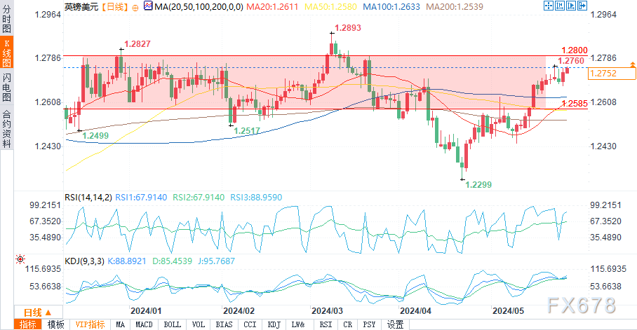 英镑/美元在1.2750美元下方看跌,上破该水平可能会提振看涨情绪。
