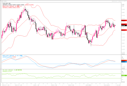 周四(5月30日),澳元/美元上涨0.32%.从0.6580-90强支撑位反弹收盘在0.6632。周四当天美国GDP修正值数据疲软,美联储降息希望不减,稍稍提振澳元。近期澳元/美元的走势纠结在美联储有望降息而澳洲央行较长时期维持较高利率的预期变化,它们当中谁占上风,则影响到该货币对的走势。目前,由于澳洲通胀仍顽固,澳洲央行预计要到明年7月或8月才会首次降息,这或许能成为支撑澳元的潜在因素。但是,大宗商品走软,尤其是铜价的大幅下滑,可能限制澳元涨势。日线图上,澳元/美元进入窄幅震荡走势,布林带喇叭口收缩,波动区间主要集中于0.6680-0.6580之间,汇价突破上述区间任一端,或才能显现明显的走势趋向。