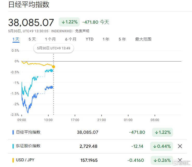 日经225指数一度跌2.4%创逾1个月新低,现跌1.22%报38058点;日本东证指数下跌0.44%。