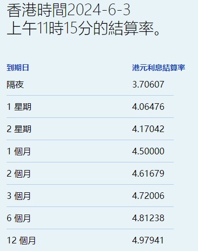 6月3日,港元拆息普遍下降,其中,隔夜息大跌近77个基点,低见3.70607%,创两周新低。与楼按有关的一个月拆息结束三连跌,回升至4.5%,见近一周新高。
