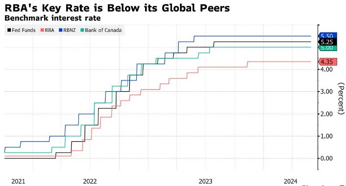 这就是为什么大多数经济学家和市场仍然预计澳洲联储将在更长时间内保持高利率,而不是再次加息。该央行本身发出了一个强烈的信号,表明进一步姐的门槛很高。在2022年5月至2023年11月期间,该央行曾13次加息,将借贷成本推至12年高点。