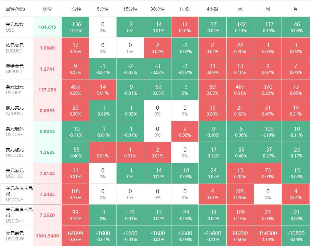 美国通胀数据显示小幅下降,缓解了部分对于物价上涨的压力。根据美国商品期货交易委员会(CFTC)的数据,投机者对美国国债期货的净多头头寸达到2022年3月以来的最大,反映出市场对固定收益资产的兴趣增加。然而,美联储官员,包括纽约联储主席约翰.威廉姆斯,表示目前并不急于降息,强调了对经济表现的信心。这些观点和数据共同影响了美元的走势,导致美元在美国PCE数据下调后呈现走软态势。美元指数(DXY)周五收盘价:104.614,本周周跌0.13%。