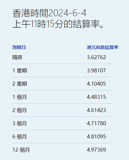 6月4日,港元拆息全线走低,其中,隔夜息进一步跌至3.62762%,创近三周新低。一星期拆息低见3.98107%,而与楼按相关的一个月拆息亦回落至4.48315%。