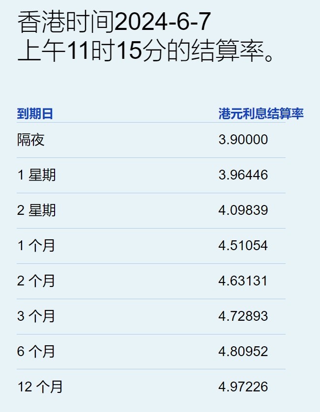6月7日,港元拆息个别发展。其中,隔夜息升20基点至3.9%;一周拆息和两周期分别为3.96446%和4.09839%。与楼按相关的一个月拆息报4.51054%,升0.983基点,连升两日。