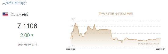 6月7日,人民币中间价报7.1106,上调2点,上一交易日中间价报7.1108。