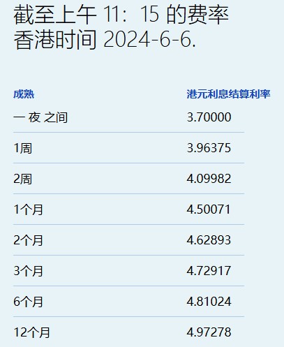 6月6日,临近端午节假期,港元拆息几乎全线向上,仅六个月及一年期走低。其中,与楼按相关的一个月拆息结束两连跌,重上4.5%。隔夜息升至3.7%,反映银行资金成本的三个月拆息报4.72917%,创近一周新高。不过,六个月及一年期分别跌至4.81024%和4.97278%。