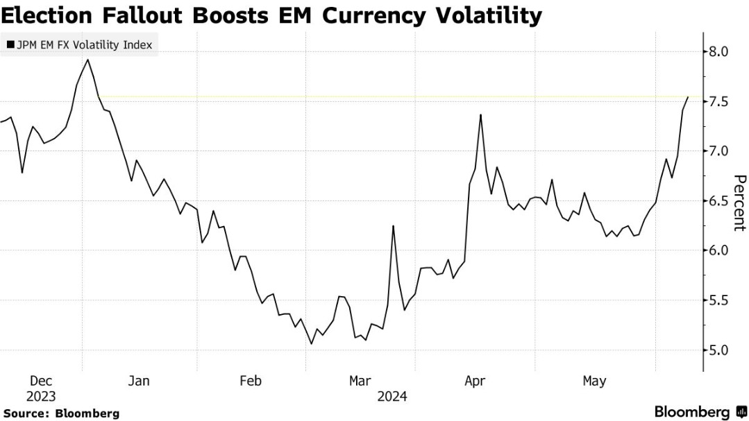 法国兴业银行的研究与战略主管Bertrand Delgado在一份报告中写道:“我们预计,与选举前相比,新兴市场货币将反映出更高的风险溢价,并且在短期内仍将保持波动。”这反映了市场对政治不确定性的敏感反应,以及它对货币价值和全球金融市场稳定性的深远影响。