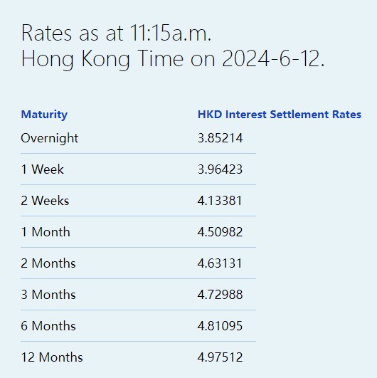 6月12日,港元拆息普遍回升,其中,隔夜拆息轻微反弹5基点至3.85214%,一周拆息亦从逾三周低位回升至3.96423%,但与楼按相关的一个月拆息则维持4.50982%。