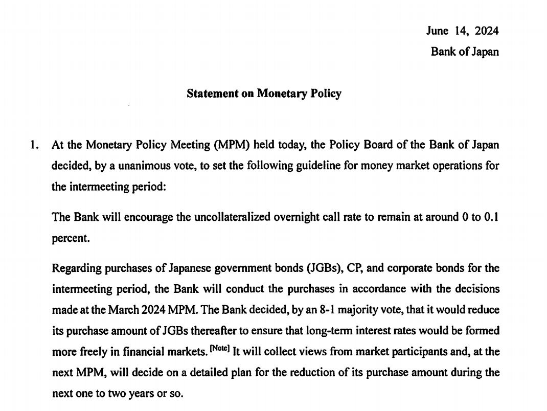 北京时间6月14日午间,日本央行公布6月份利率决议,宣布维持利率在0%-0.1%不变,符合市场预期。日本央行表示,将按照此前3月份的决定购买国债,此后将缩减购债规模。对于如何缩减购债规模,日本央行表示,将在下次会议上明确债券购买的详细计划。