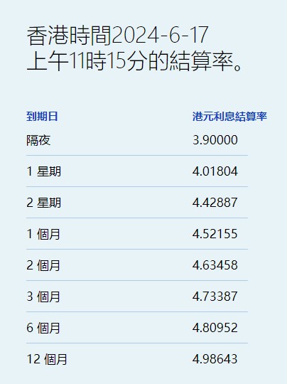 6月17日,港元拆息几乎全线上升,仅隔夜息维持3.9%。一星期拆息升至4.01804%,创两周新高。与楼按相关的一个月拆息亦结束两连跌,报4.52155%,为4月2日以来最高。