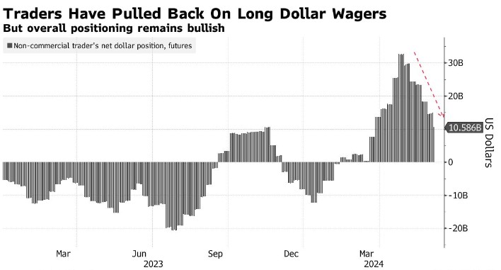 非商业交易员——包括资产管理公司、对冲基金和其他投机性市场参与者——自4月份看涨美元的短期峰值以来,已削减了逾三分之二的美元多头头寸。他们目前持有约106亿美元与美元走强相关的押注,为3月中旬以来的最低水平。
