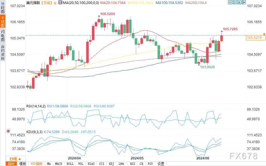 汇通财经APP讯——周五(6月14日)欧盘时段,美元指数盘中报105.5545,涨幅0.31%。