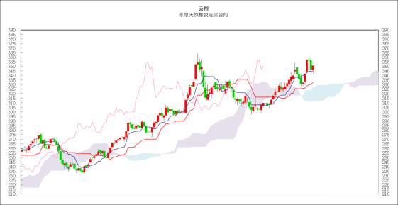 技术方面来看,东京橡胶在大幅震荡后回到350日元整数位一线收盘,短期呈现较为明显的高位振荡走势。一目均衡表上来,价格实体距离中期基准线较远,不排除有进一步下跌调整的可能。交易策略上建议逢高做空。