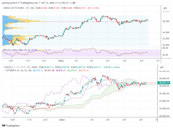 昨天的东京证券市场,在等待重要经济事件的背景下,持仓调整交易占据上风,日经平均指数未能保持39000日元整数位,小幅收低在38800日元水平。前一天的美股市场上,尽管NY道琼斯指数小幅收低,但高科技股比重较高的纳斯达克综合指数和机构投资者更加青睐的标普500指数继续上扬,并双双创下日内新高。东京市场的早盘尽管受到来自持仓调整的卖盘牵制,日经平均指数仍然表现出较强的韧性,市场整体并没有出现恐慌性的抛售。在等待美国消费者物价指数(CPI)的结果,FOMC 会议以及本周末日本央行的货币政策会议的背景下,总体呈现较强的观望氛围。进入欧美交易时间,先是美国5月份消费者价格指数(CPI)低于市场预期,推动标普500指数和纳斯达克综合指数,连续第三天创下新高。然而,之后公布的美国联邦公开市场委员会(FOMC)利率展望显示年底前仅有一次降息预期,使得美股市场各指数纷纷从盘中高点回落收盘。NY道琼斯指数最后也小幅收低在38700美元一线。日经指数期货在高科技表现强劲的影响下,最后收高在39200日元一线水平。