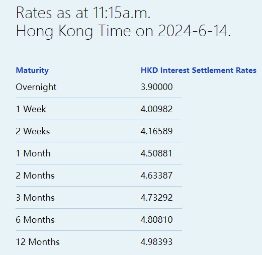 6月14日,港元拆息涨跌不一,隔夜拆息回落至3.9%。一周拆息升至4.00982%,创近一周新高。不过,与楼按相关的一个月拆息连跌两天,报4.50881%。