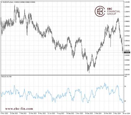 欧元兑瑞郎还在延续下行趋势,相对强弱指标展示出超卖信号。头肩顶形态预示接下来跌幅加深,支撑位可能在0.9400附近。