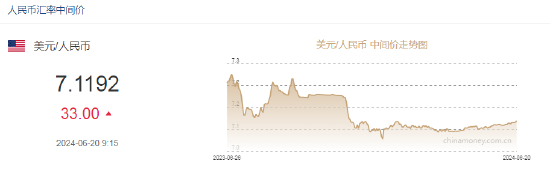 6月20日,人民币中间价报7.1192,下调33点,上一交易日中间价报7.1159。