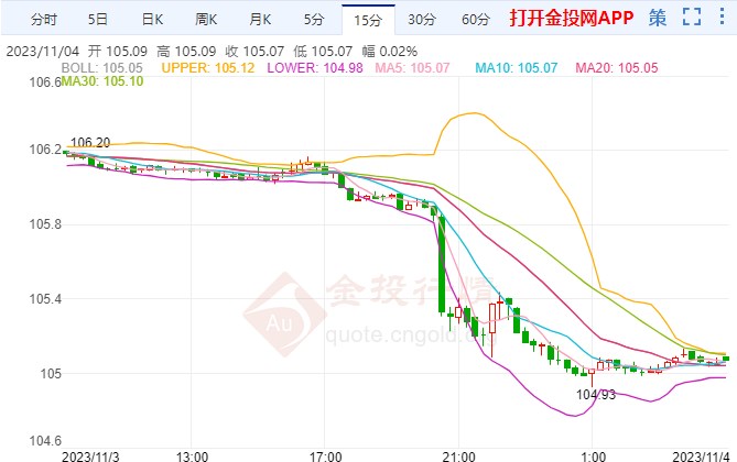周一(11月6日)亚市盘中,美元指数小幅上涨,目前交投于105附近,截止北京时间09:55,美元指数报价105.09,涨幅0.04%,上一交易日,随着美国就业数据和ISM服务业数据弱于预期增强了对美联储加息结束的猜测,美元指数重挫,盘中向下触及105关口,为9月20日以来首次,最终收跌1.017%,报105.08。