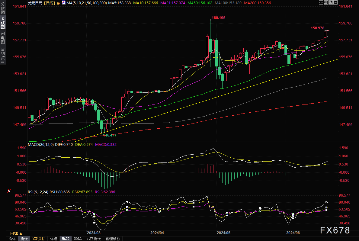 汇通财经APP讯——周五(6月21日),美元/日元上涨逼近159,日本首席货币外交官神田真人表示,如果有必要,他将指示日本央行进行干预,这意味着市场仍需警惕“黑天鹅”事件随时上演。技术分析指出,美元/日元进入超买前,有望突破160大关。