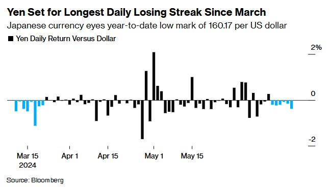 日元创下了自3月以来最长的跌势,至34年低点,这加大了日本当局再次出手干预汇市以支撑日元的风险。周四,日元兑美元汇率连续第六个交易日下跌,收盘时接近1美元兑159日元,这是1990年4月以来的最低收盘水平,距离1美元兑160.17日元这一年内低点仅一步之遥。