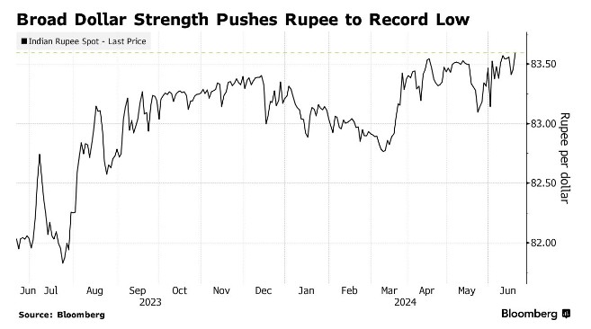印度卢比跌至历史新低,因美元走强令大多数亚洲新兴货币承压。数据显示,周四,印度卢比兑美元一度下跌0.3%,至83.67,超过了4月份触及的前低83.5750。