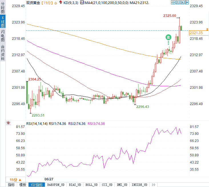 特别值得注意的是,美国GDP数据公布后15分钟,黄金价格显著上涨,涨幅约10美元,显示出市场对这一经济指标的敏感性。现货黄金日内涨幅超过1.00%,报2321.34美元/盎司,而COMEX黄金期货主力合约日内涨幅为0.80%,报2331.80美元/盎司。这一上涨可能反映了市场对经济数据的正面解读,以及对黄金作为避险资产的需求。