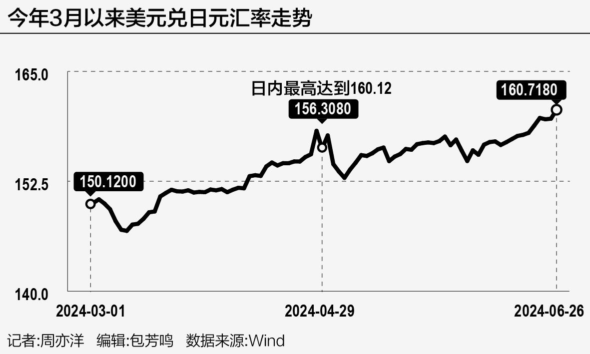记者陈植上海报道截至6月27日16时30分,日元兑美元汇率徘徊在160.59附近,盘中一度创下过去40年以来的最低点160.86。在此背景下,金融市场对日本当局再度干预汇市“稳汇率”预期骤增。