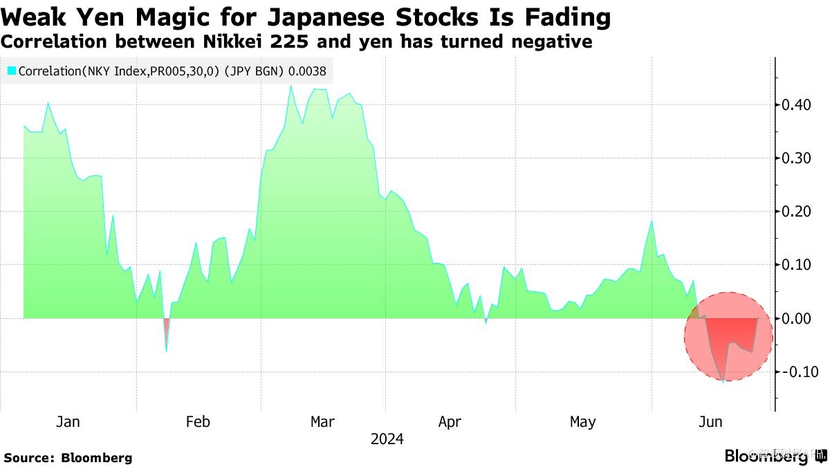 在过去两周的大部分时间里,日经225指数与日元之间的30天相关性为负值,因为投资者开始担心日元持续贬值可能会增加进口成本、损害消费者的购买力,从而对经济造成损害。