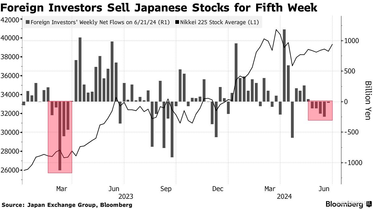 根据日本交易所的数据,在截至6月21日的一周内,外国投资者净卖出214亿日元(合1.334亿美元)的股票。日本股市在此期间下跌,因为欧洲挥之不去的政治风险打压了市场情绪。
