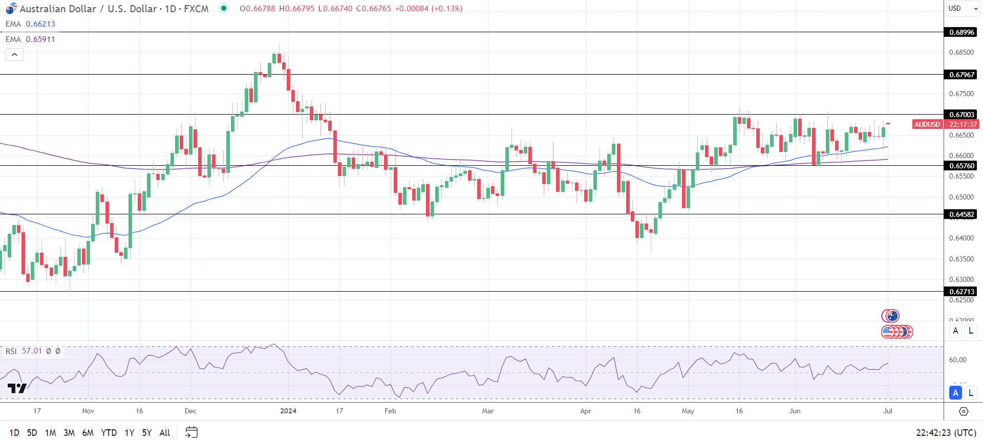 14周期每日RSI读数为57.01,澳元可能攀升至0.67500美元左右,然后进入超买区域。