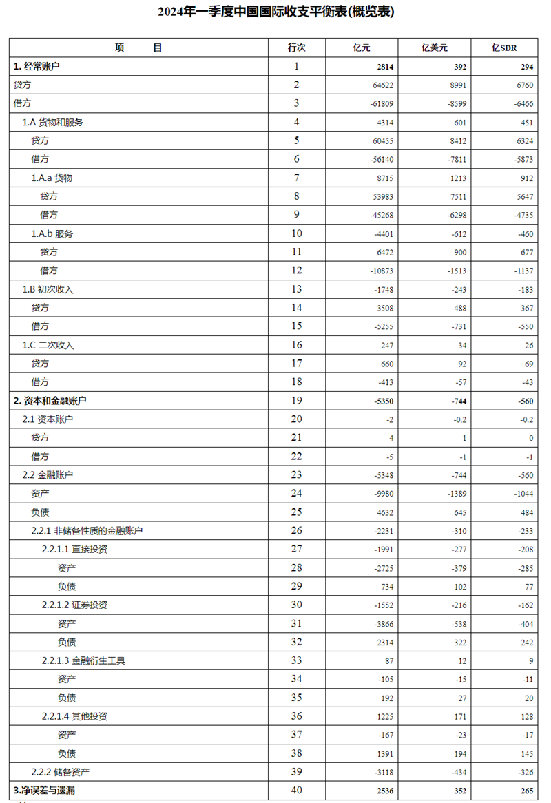 按SDR计值,2024年一季度,我国经常账户顺差294亿SDR,资本和金融账户逆差560亿SDR,其中,非储备性质的金融账户逆差233亿SDR,储备资产增加326亿SDR。