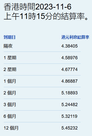 11月6日,港元拆息多数反弹,其中,隔夜息结束三连跌,回升至4.38405%,与楼按相关的一个月拆息亦由近八周新低略为反弹至4.86887%,两个月拆息报5.18893%,创逾一个月新高。