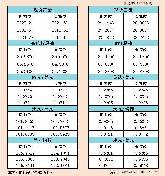 汇通财经APP讯——本文提供黄金、白银、原油、美元指数、欧元、英镑、日元、瑞郎、澳元支撑阻力位。