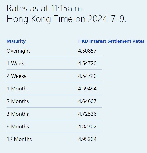 7月9日,港元拆息近乎全线向上,其中,隔夜拆息微升至4.50857%,而与楼按相关的一个月拆息亦连升两天,报4.59494%,为6月28日以来最高;反映银行资金成本的三个月拆息微升至4.72536%,创近一周新高。