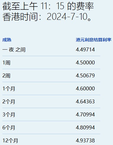 7月10日,港元拆息几乎全线回软,其中,隔夜息微穿4.5%,低见4.49714%,但与楼按相关的一个月拆息连升三天,今报4.6%,为6月28日以来最高。此外,一周拆息降至4.5%;反映银行资金成本的三个月拆息亦由近一周新高回落至4.70994%。六个月及一年期分别微跌近2基点至4.80994%和4.93738%。