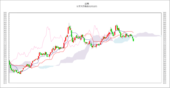 技术方面来看,东京橡胶突破325-335日元区间的下限后,呈现较强的下行趋势。一目均衡表上来看,价格实体下跌至中期基准线以下水平,同时也向下穿过云层也显示较强的做空信号。交易策略上建议逢高抛空。