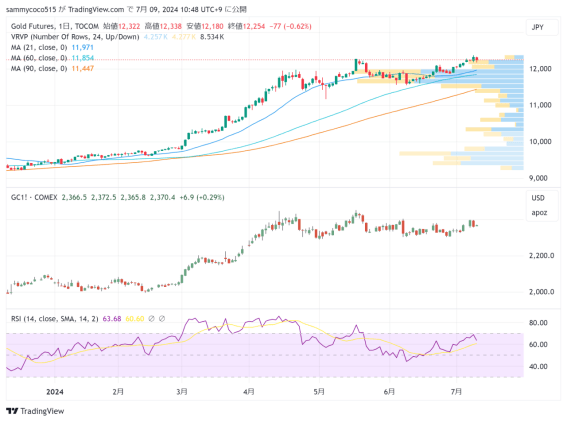 东京市场方面,虽然美元兑日元汇率保持160日元一线支撑,但由于NY黄金价格的回落至,导致东京主力合约来到12200日元一线水平收盘。