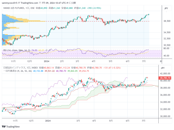 昨天的东京证券市场,在前一天创下新高后获利了结的压力下,日经平均指数小幅回落至40700日元一线收盘。上周末的美股市场上由于,美国6月份就业统计显示劳动市场供需缓和,增强了美联储年内降息的预期。由于日经平均指数上周大幅上涨超过1300日元,东京市场早盘在高位开盘后便遭遇较强的获利了结压力。另一方面,有市场分析显示本周伴随ETF分红将有数千亿日元规模的空单压力,结合股指期货市场上的调整交易,尾盘小幅收低。进入欧美交易时间,在美联储主席鲍威尔出席国会听证以及美国6月份消费者物价指数公布之前,市场上呈现出以持仓调整为主的抛售压力。NY道琼斯指数上周末小幅收低在39300美元一线。另一方面,高科技股依旧保持强势,纳斯达克综合指数连续创下新高。受此影响,日经指数期货晚盘回到40900日元的近期高位收盘。