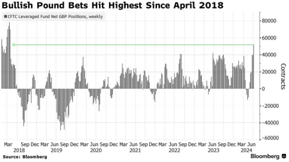 美国商品期货交易委员会(CFTC)最新持仓数据显示,就在7月4日投票前几天,杠杆基金持有的英镑净多头头寸在截至7月2日的一周内跃升至2018年4月以来的最高水平。这些投机性押注增加的原因是,英镑兑美元汇率升至近一个月来的最强水平,而英镑兑欧元汇率则徘徊在两年来的高点附近。