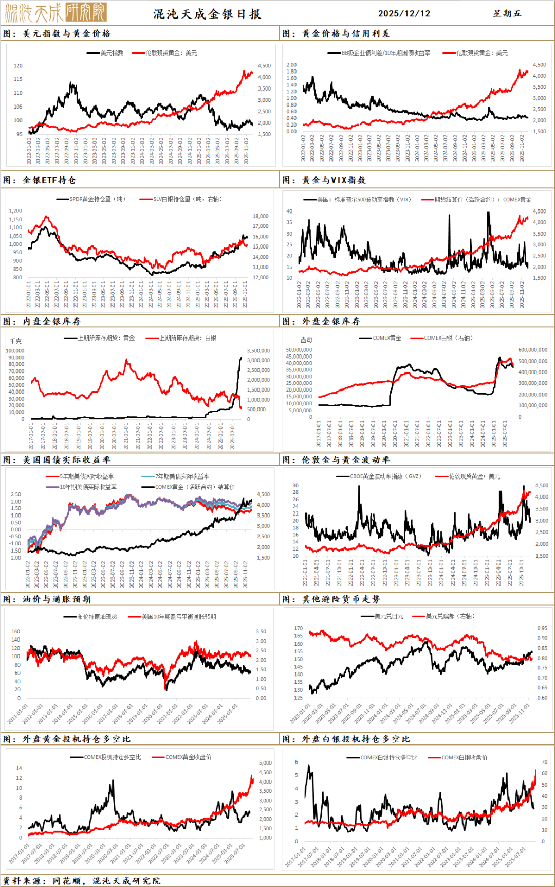 美联储年内最后一次议息会议落地,未释放鹰派情绪,在前几日的回调后,市场宽松交易再次回归反弹。贵金属受到支撑,金银比在白银“逼仓行情下”仍在走低,贵金属整体行情长期仍驱动向上,整体警惕VIX低位情况下的短线风险。